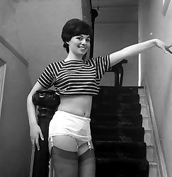 Excited beauty with nice body and in sexy retro lingerie poses right on the stairs this time